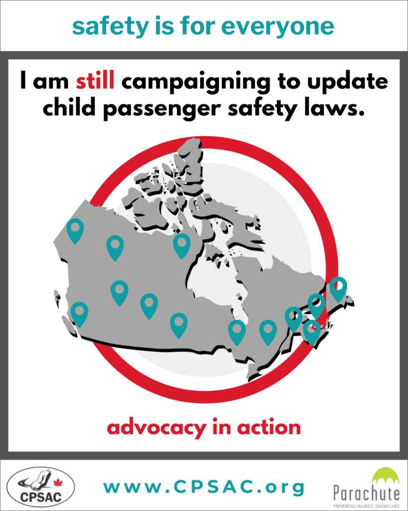 Starting in 2023 CPSAC has partnered with Parachute and Child Safety Link to recommend improvements to child passenger safety legislation in each province and territory. We – Parachute and CPSAC – encourage CPSTs to join the effort by calling for change from your provincial/territorial and municipal government representatives. Below is a template email that you can send to your ministers and MPPs. We welcome you to customize the email if you wish. We have provided a table below listing the specific email addresses for the appropriate ministers in each jurisdiction, as well as links to find your local MPP.