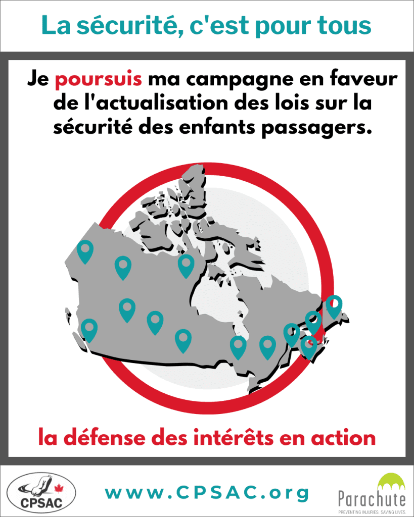 Depuis 2023, l’ASEPC a établi un partenariat avec Parachute et Child Safety Link pour recommander des améliorations à la législation sur la sécurité des enfants passagers dans chaque province et territoire. Nous – Parachute et l’ASEPC – encourageons les TSEP à se joindre à l’effort en demandant des changements à leurs représentants provinciaux/territoriaux et municipaux. Vous trouverez ci-dessous un modèle de courriel que vous pouvez envoyer à vos ministres et députés provinciaux. Nous vous invitons à personnaliser ce courriel si vous le souhaitez. Vous trouverez ci-dessous un tableau indiquant les adresses électroniques des ministres compétents dans chaque juridiction, ainsi que des liens pour trouver votre député local.