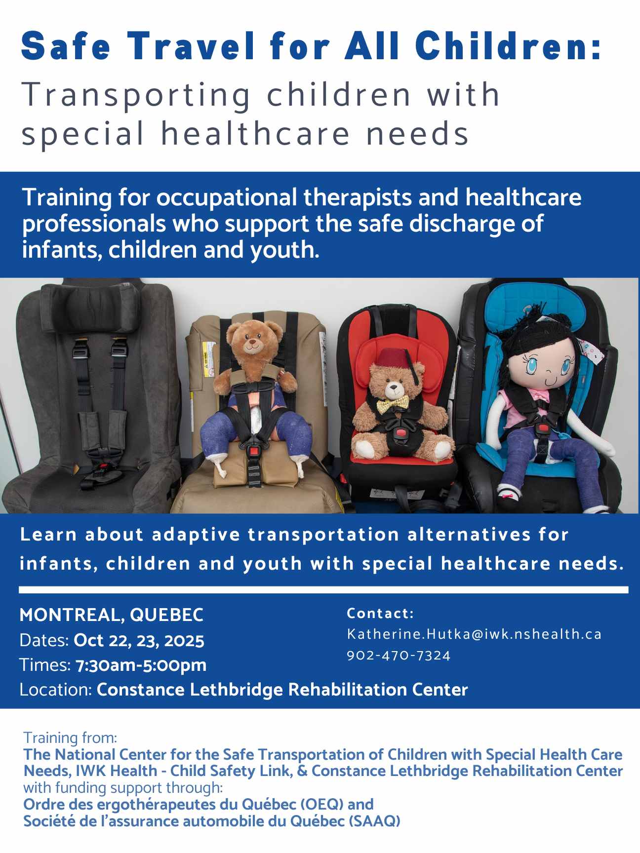 “Safe Travel for All Children: Transporting Children with Special Healthcare Needs” is designed to serve as an enrichment training for Child Passenger Safety Technicians (CPSTs). This initiative is specifically intended for occupational therapists, physiotherapists, medical equipment vendors, or other health care staff who directly support the safe positioning and transportation needs of children and youth as part of their role.